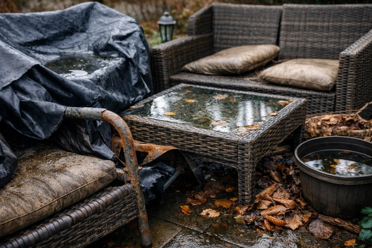 | Furniture on wet ground with trapped cover | Technically possible but poor idea | High | Improve drainage and cover fit before winter |